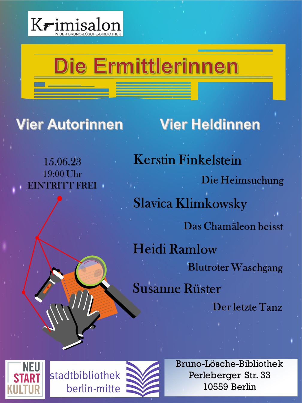 Der Krimisalon in der Bruno-Lösche-Bibliothek (Perleberger Straße 33, 10559 Berlin) lädt am 15. Juni, um 19.00 Uhr, zur Krimilesung „Die Ermittlerinnen“. „Vier Autorinnen – vier Heldinnen“ heißt es an diesem Abend zum Genre Krimi. Die Schriftstellerinnen tauchen in die spannungsgeladene Welt des Verbrechens ein. Mit dabei Kerstin Finkelstein „Die Heimsuchung“, Slavica Klimkowsky „Das Chamäleon beißt“, Heidi Ramlow „Blutroter Waschgang“ und Susanne Rüster „Der letzte Tanz“ – sie alle gehören zur Regionalgruppe der Berliner Mörderischen Schwestern e.V. Die Veranstaltung wird gefördert von Neustart Kultur. Der Eintritt ist frei. Telefonische Anmeldungen unter: 030-901833025.