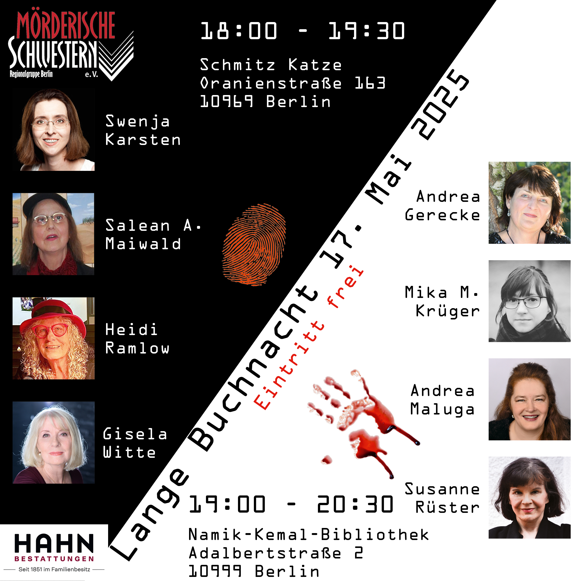 Auch in diesem Jahr findet die nun bereits 26. Lange Buchnacht in der Oranienstraße bei überall freiem Eintritt statt. Die Mörderischen Schwestern Berlin sind am Sonnabend, den 17. Mai 2025, an zwei Veranstaltungsorten dabei. In „Schmitz Katze“ geht es von 18 bis 19.30 Uhr kriminell zu (Oranienstraße 163, 10969 Berlin). Die literarischen „Schwestern“ Swenja Karsten, Salean A. Maiwald, Heidi Ramlow, Vanne van Ares und Gisela Witte lesen Krimi-Geschichten. Garantierte Spannung bis zum Schluss. Um 19 Uhr beginnt für anderthalb Stunden die Lesung in der Mittelpunktbibliothek Wilhelm Liebknecht /Namik Kemal (Adalbertstraße 2, 10999 Berlin). Im Gepäck der Autorinnen Andrea Gerecke, Mika M. Krüger, Andrea Maluga und Susanne Rüster: mörderisch gute Werke. Zur Langen Buchnacht können alle Literaturbegeisterten die Oranienstraße entlang flanieren und immer wieder Halt machen, um den unterschiedlichen Lesungen zu lauschen. Sämtliche teilnehmenden Orte gestalten ihr Programm eigenverantwortlich.