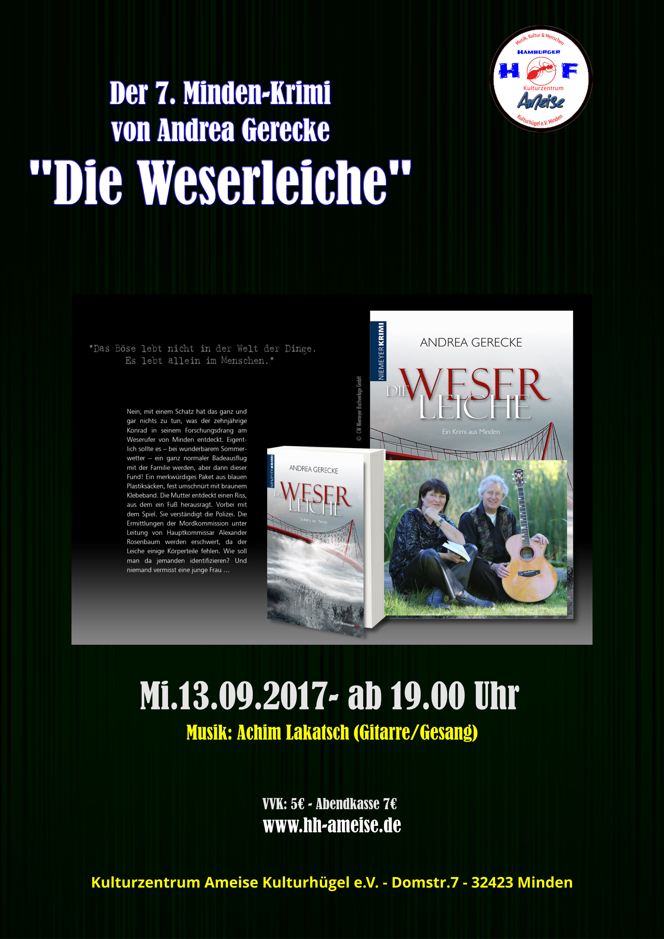 Zur Buchpremiere des 7. Minden-Krimis „Die Weserleiche“ laden Niemeyer Verlag, Mindener Tageblatt und Autorin Andrea Gerecke am Mittwoch, den 13. September, 19.30 Uhr ins Kulturzentrum Hamburger Hof/Ameise Kulturhügel (Markt 9, 32423 Minden, Einlass ab 19 Uhr) ein. Den musikalischen Part übernimmt in bewährter Form Achim Lakatsch (Gitarre/Gesang) mit eigenen Kompositionen und traditionellen irischen Weisen. Außerdem ist das leckere Buffet nach Art des Hauses im Angebot. Der Eintritt kostet 5 Euro (Vorverkauf, Abendkasse 7 Euro), und der Erlös des Abends wird der Förderung der Kultur gespendet – speziell dem nächsten WeserLeser Literaturfestival 2018. Kartenvorverkauf/-reservierungen im Hamburger Hof (Telefon 0571/87 72 3, info@hamburger-hof-ameise.de).