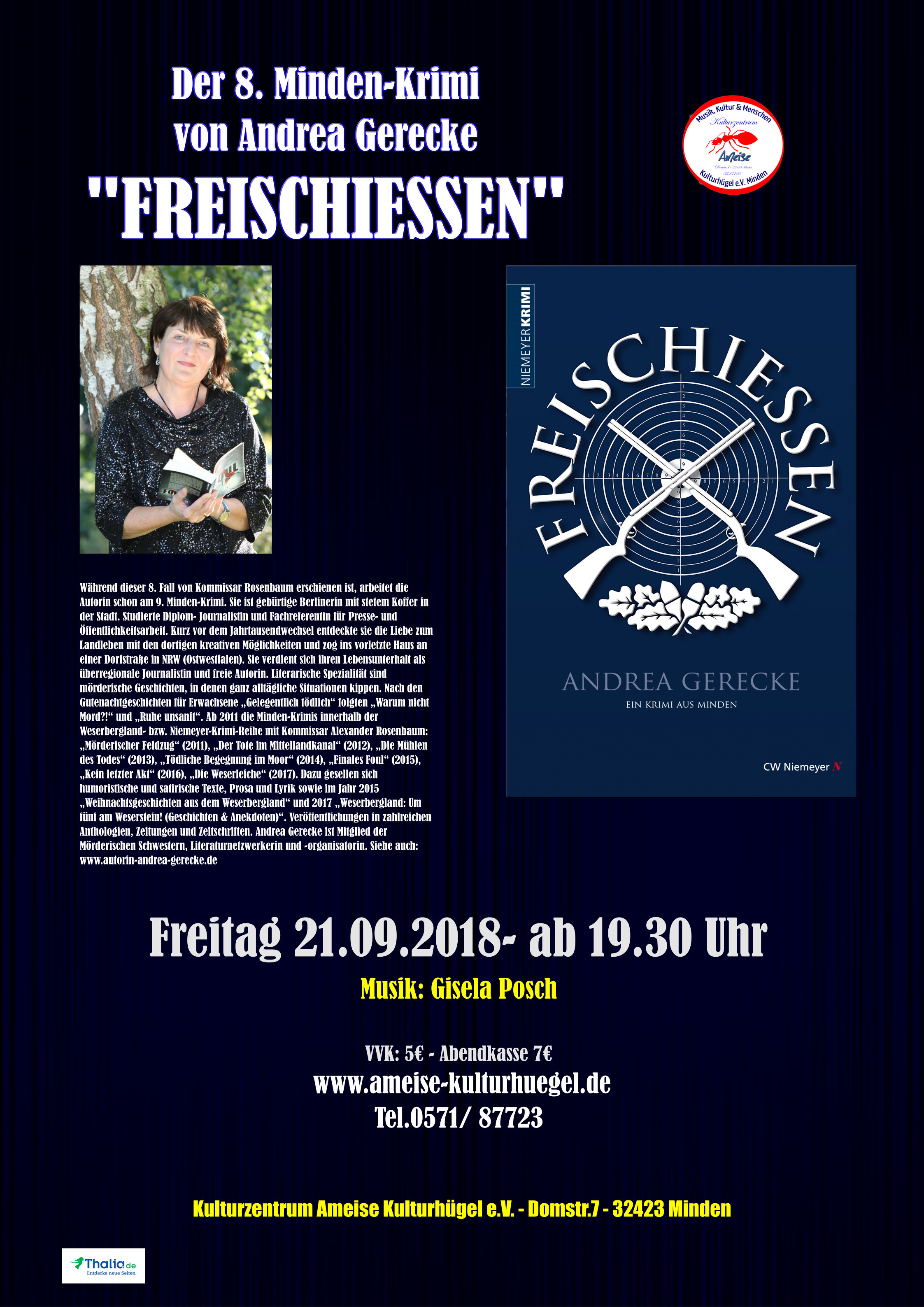 Ganz aktuell auf dem Buchmarkt ist der nächste Minden-Krimi von Schriftstellerin Andrea Gerecke erschienen (CW Niemeyer Buchverlage, Hameln). Zur Premierenveranstaltung am Freitag, den 21. September, 19.30 Uhr wird herzlich ins Kulturzentrum Ameise Kulturhügel (Domstraße 7, 32423 Minden) eingeladen. Diesmal geht es thematisch um das traditionsreiche Freischießen, in dessen Umfeld Hauptkommissar Alexander Rosenbaum ermittelt – in seinem achten Fall in jährlicher Folge, seit 2011. Ein Toter wirft viele Fragen auf. Einige Passagen aus dem Buch sollen neugierig auf mehr machen, außerdem liefert die Autorin (geboren in Berlin und in Hille zu Hause) Hintergründe zur Entstehungsgeschichte, und im Anschluss wird signiert. Musikalisch ist erneut Gisela Posch mit Harfe und Gesang an der Seite von Andrea Gerecke zu erleben. Mit einem Büchertisch steht die Buchhandlung Thalia bereit.