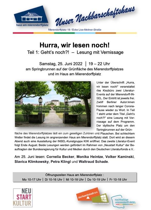 Unter der Überschrift "Hurra, wir lesen noch!" veranstaltet das Kiezbüro zwei Literatur-Events auf der Mierendorff-INSEL. Der Eintritt ist frei. Beide Lesungen werden gefördert im Rahmen von "Neustart Kultur" der Beauftragten der Bundesregierung für Kultur und Medien durch den Deutschen Literaturfonds e.V..