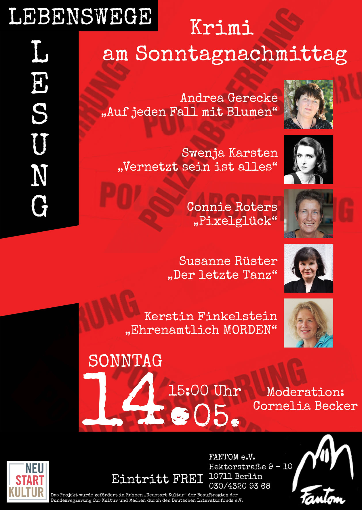 Vier Veranstaltungen umfasst die Lesereihe „Lebenswege“ in der Berliner Galerie Fantom, Teil drei startet am 14. Mai 2023 um 15 Uhr: Kriminellen Lebenswegen gehen die Autorinnen Kerstin Finkelstein, Andrea Gerecke, Swenja Karsten, Connie Roters und Susanne Rüster nach, wenn es heißt „Krimi am Sonntagnachmittag“. Es moderiert Cornelia Becker. Unterhaltsamer Grusel garantiert!