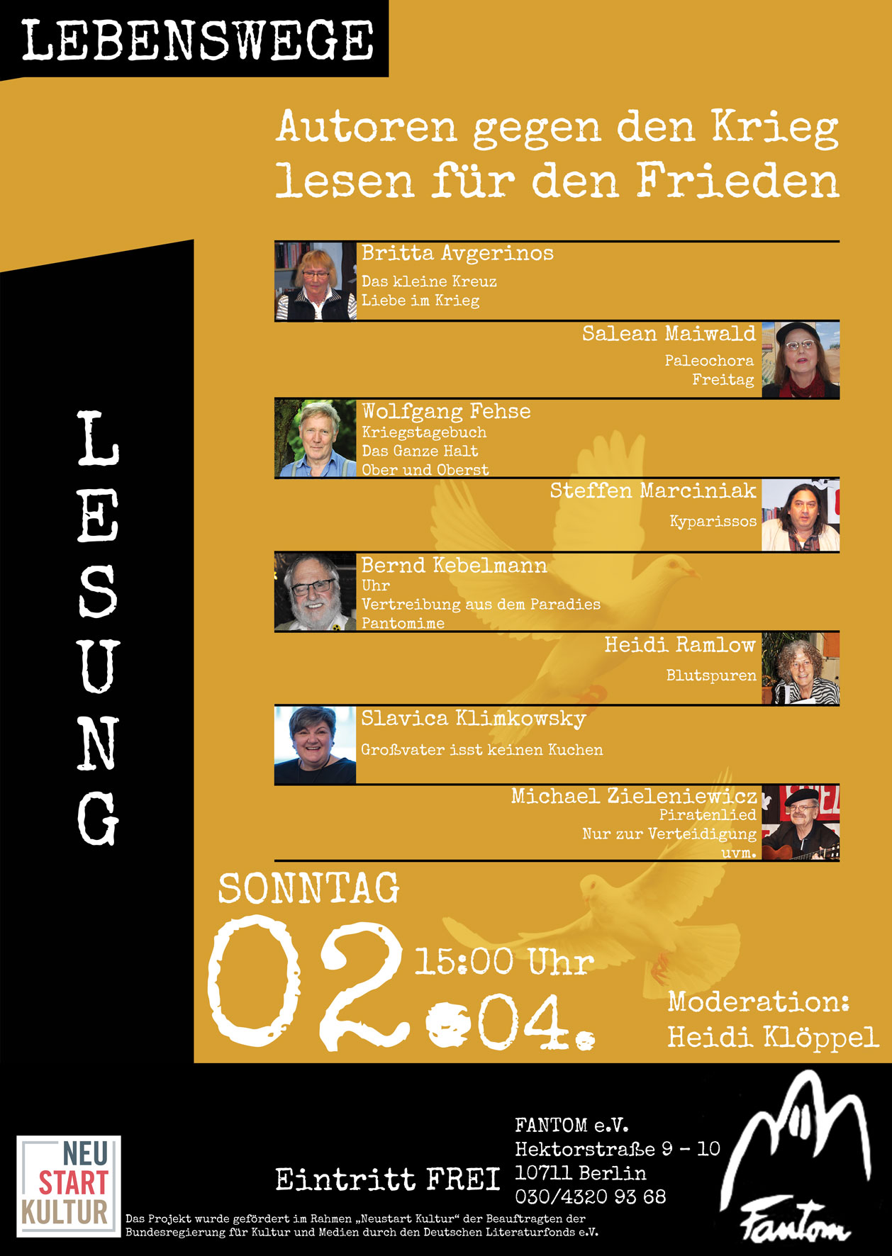 Beim monatlichen Stammtisch des Verbandes deutscher Schriftstellerinnen und Schriftsteller (VS) vor sechs Jahren hat sich, auf Vorschlag von Wolfgang Fehse, die Gruppe "Autoren gegen den Krieg - lesen für den Frieden" gebildet. Unter Fehses künstlerischen Leitung haben die Autor:innen in den letzten Jahren bei zahlreichen, meist Benefiz-Lesungen, selbstverfasste Prosa und Lyrik vorgetragen. Sie wollen nicht belehren, sondern anregen zum Gespräch. Angeschlossen hat sich ihnen der Kabarettist und Chasonnier Michael Z. Von den Mörderischen Schwestern dabei Slavica Klimkowsky, Salean Maiwald und Heidi Ramlow.