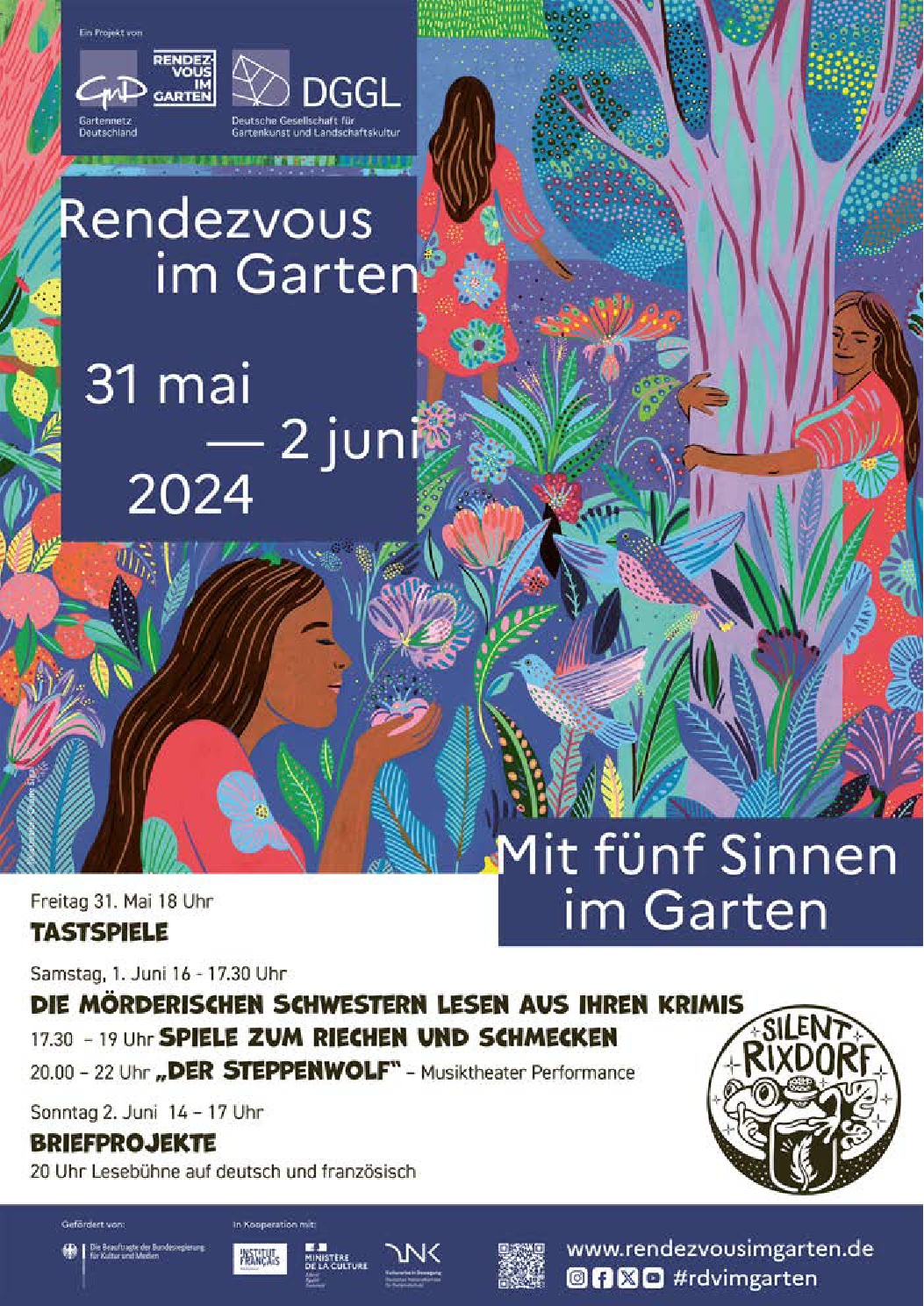 SilentRixdorf ist ein Nachbarschaftsgarten mitten in Neu-Kölln. In dieser üppig begrünten Nische inmitten der Hauptstadt werden vom 31. Mai bis 2. Juni alle fünf Sinne mit einem abwechslungsreichen Programm angesprochen. Am Samstag, dem 1. Juni, lassen 3 Mörderische Schwestern ihren kriminellen Ideen freien Lauf. Zumindest auf dem Papier. Ein Hörgenuss. Den Geschmacksinn kann man bei Kaffee und Kuchen befriedigen.
