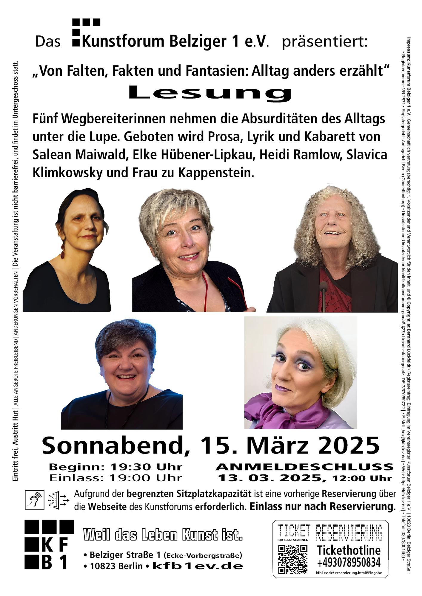 Fünf Wegbereiterinnen nehmen die Absurditäten des Alltags unter die Lupe. Geboten wird Lyrik, Prosa und Kabarett von Salean Maiwald, Elke Hübener-Lipkau, Heidi Ramlow und Frau zu Kappenstein. Nicht barrierefrei!
